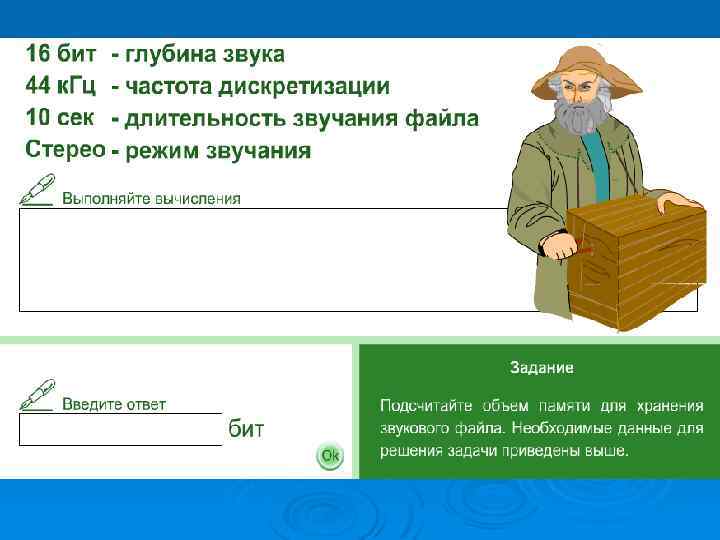 Об'єм файлу (біт) = частота (Гц) * глибина (біт) * час (сік) * режим (моно = 1, стерео = 2)