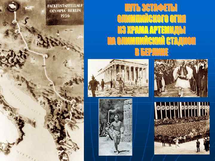 ЦЕРЕМОНИЯ ОТКРЫТИЯ ИГР На церемонии открытия Игр была продолжена существующая с 1928 года традиция зажжения Олимпийского огня, причем впервые огонь был доставлен из Олимпии бегунами, передающими факел, как эстафетную палочку. Этим было положено начало традиции Эстафеты Олимпийского Огня. Открытие Олимпиады впервые транслировалось по телевидению в прямом эфире, а олимпийские соревнования стали материалом для создания шедевра кинодокументалистики — фильма Лени Рифеншталь «Олимпия» . Игры совпали с президентством В МОК Анри де Байе – Латура из Бельгии. Он не дал согласие верховному канцлеру фашистской Германии Адольфу Гитлеру для выхода к пьедесталу почёта и награждения победителей и призёров