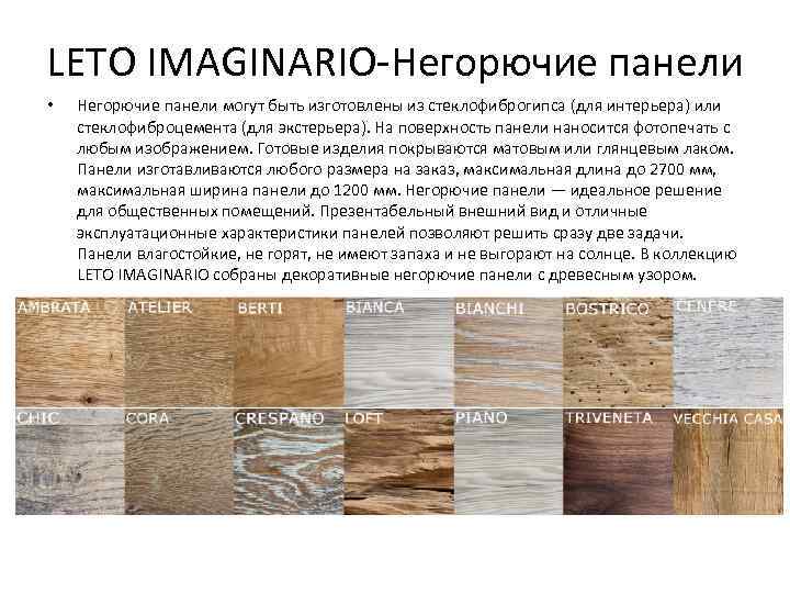 LETO IMAGINARIO-Негорючие панели • Негорючие панели могут быть изготовлены из стеклофиброгипса (для интерьера) или стеклофиброцемента (для экстерьера). На поверхность панели наносится фотопечать с любым изображением. Готовые изделия покрываются матовым или глянцевым лаком. Панели изготавливаются любого размера на заказ, максимальная длина до 2700 мм, максимальная ширина панели до 1200 мм. Негорючие панели — идеальное решение для общественных помещений. Презентабельный внешний вид и отличные эксплуатационные характеристики панелей позволяют решить сразу две задачи. Панели влагостойкие, не горят, не имеют запаха и не выгорают на солнце. В коллекцию LETO IMAGINARIO собраны декоративные негорючие панели с древесным узором.