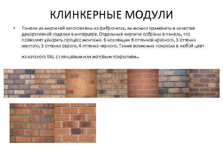 КЛИНКЕРНЫЕ МОДУЛИ • Панели из кирпичей изготовлены из фиброгипса, их можно применять в качестве декоративной отделки в интерьере. Отдельные кирпичи собраны в панель, что позволяет ускорить процесс монтажа. В коллекции 8 оттенков красного, 3 оттенка желтого, 3 оттенка серого, 4 оттенка черного. Также возможна покраска в любой цвет из каталога RAL с глянцевым или матовым покрытием .
