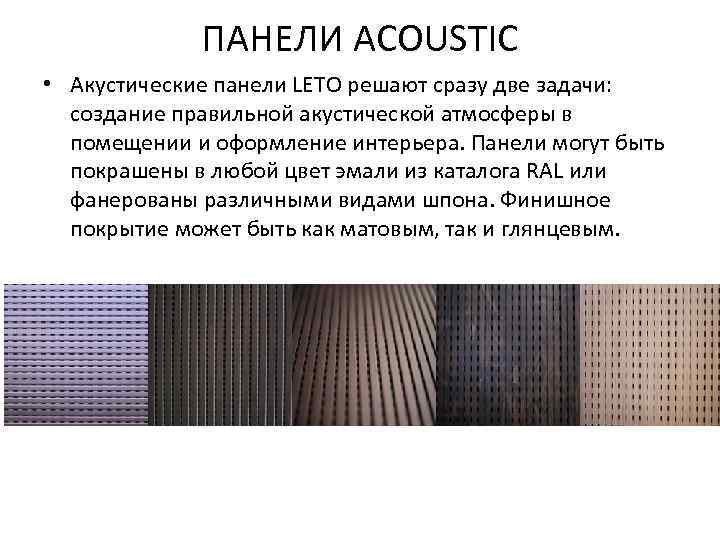 ПАНЕЛИ ACOUSTIC • Акустические панели LETO решают сразу две задачи: создание правильной акустической атмосферы в помещении и оформление интерьера. Панели могут быть покрашены в любой цвет эмали из каталога RAL или фанерованы различными видами шпона. Финишное покрытие может быть как матовым, так и глянцевым.