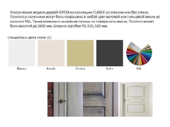 Классические модели дверей OPERA из коллекции CLASSIC со стеклом или без стекла. Полотно и наличники могут быть покрашены в любой цвет матовой или глянцевой эмали из каталога RAL. Также возможно нанесение патины на поверхность эмали. Полотно может быть высотой до 2600 мм. Ширина коробки 95, 110, 120 мм.