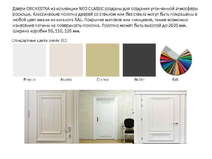Двери ORCHESTRA из коллекции NEO CLASSIC созданы для создания утонченной атмосферы роскоши. Классические полотна дверей со стеклом или без стекла могут быть покрашены в любой цвет эмали из каталога RAL. Покрытие матовое или глянцевое, также возможно нанесение патины на поверхность полотна. Полотно может быть высотой до 2600 мм. Ширина коробки 95, 110, 120 мм.