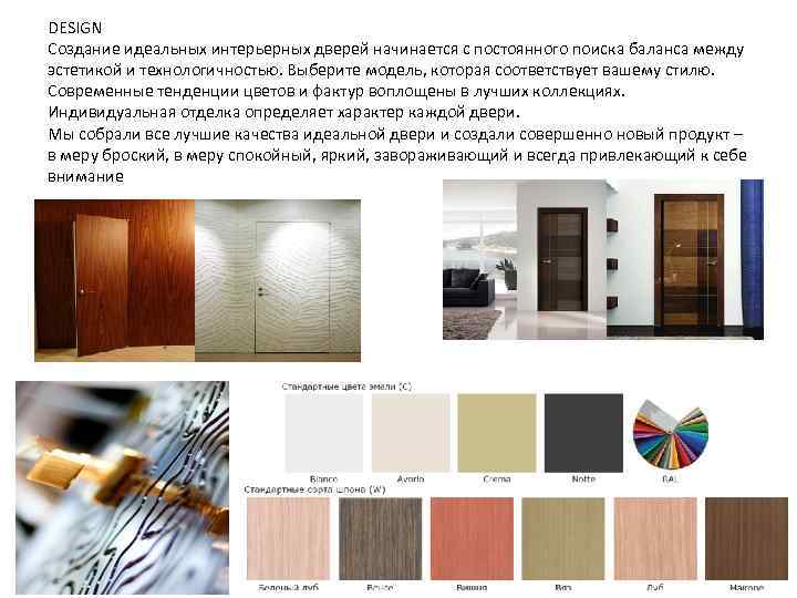 DESIGN Создание идеальных интерьерных дверей начинается с постоянного поиска баланса между эстетикой и технологичностью. Выберите модель, которая соответствует вашему стилю. Современные тенденции цветов и фактур воплощены в лучших коллекциях. Индивидуальная отделка определяет характер каждой двери. Мы собрали все лучшие качества идеальной двери и создали совершенно новый продукт – в меру броский, в меру спокойный, яркий, завораживающий и всегда привлекающий к себе внимание