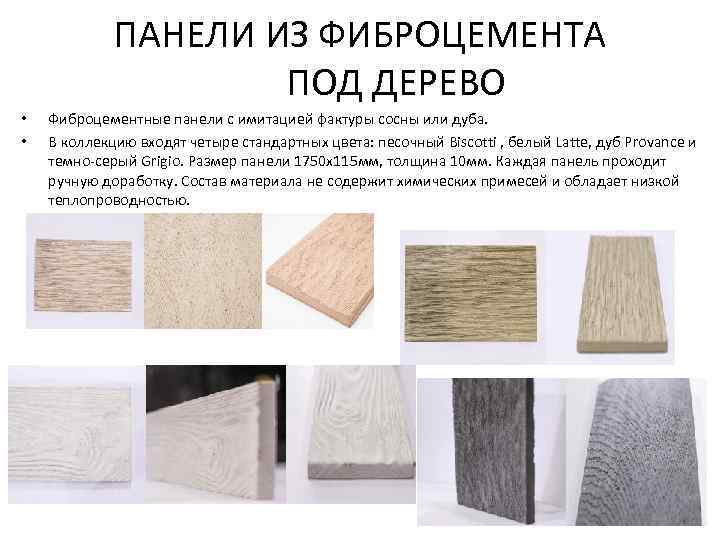 ПАНЕЛИ ИЗ ФИБРОЦЕМЕНТА ПОД ДЕРЕВО • • Фиброцементные панели с имитацией фактуры сосны или дуба. В коллекцию входят четыре стандартных цвета: песочный Biscotti , белый Latte, дуб Provance и темно-серый Grigio. Размер панели 1750 х115 мм, толщина 10 мм. Каждая панель проходит ручную доработку. Состав материала не содержит химических примесей и обладает низкой теплопроводностью.