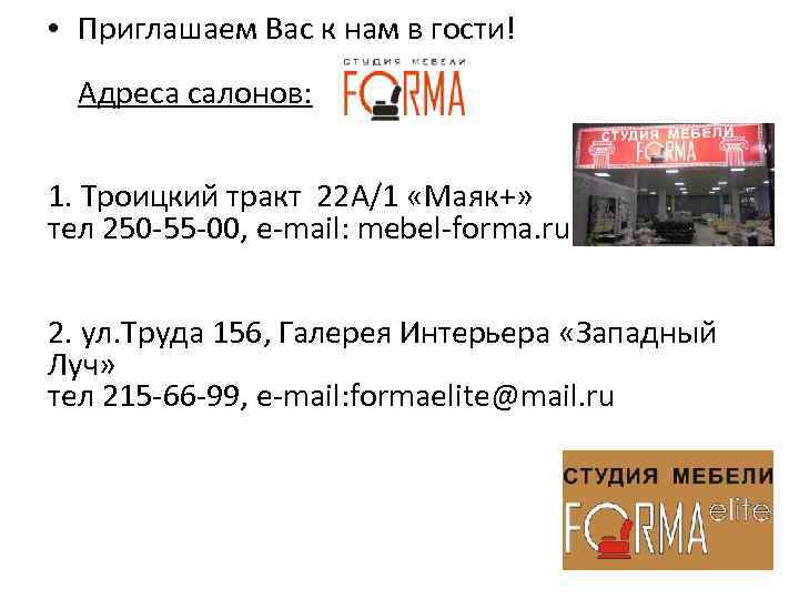• Приглашаем Вас к нам в гости! Адреса салонов: 1. Троицкий тракт 22 А/1 «Маяк+» тел 250 -55 -00, e-mail: mebel-forma. ru 2. ул. Труда 156, Галерея Интерьера «Западный Луч» тел 215 -66 -99, e-mail: formaelite@mail. ru