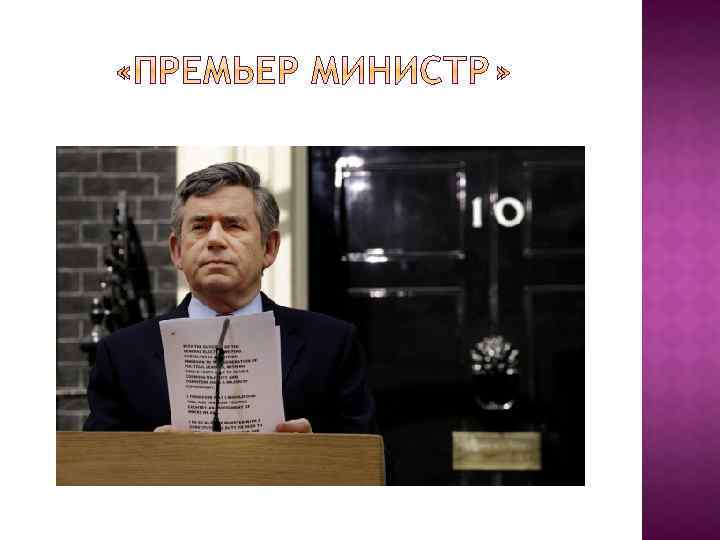 Премьер-министр Соединённого королевства Великобритании и Северной Ирландии является главой правительства и исполняет многие из исполнительных функций, номинально принадлежащих Суверену, который является главой государства. Согласно обычаю, Премьер-министр и кабинет (который он возглавляет) отвечают за свои действия перед парламентом, членами которого они являются. С 2007 года пост премьер-министра занимает Гордон Браун из лейбористской партии)Как указывает название должности, Премьер-министр является главным советником монарха. Премьер-министр традиционно живёт на Даунинг-стрит 10 в Лондоне, в доме который Георг II подарил Роберту Уолполу как личный подарок. Уолпол, однако, согласился принять его только как официальную резиденцию Первых лордов, а не как подарок для себя лично, и поселился там в 1735 году. Хотя большинство Первых лордов жили на Даунинг-стрит 10, некоторые жили в своих частных домах. Обычно так поступали аристократы, которые сами владели большими домами в центре Лондона. Некоторые, такие как Гарольд Макмиллан и Джон Мейджор жили в Доме адмиралтейства, пока на Даунинг-стрит 10 вёлся ремонт и реконструкция. Премьер-министр также может использовать загородную резиденцию Чекерс в Бакингемшире.