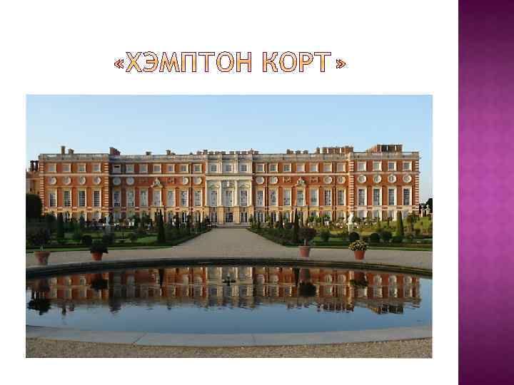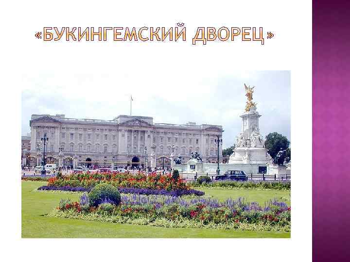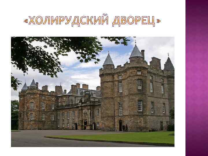 Виндзорский замок, расположенный в г. Ви ндзор (англ. Windsor) — небольшой город в графстве Беркшир, к юго-западу от Лондона, на правом берегу реки Темзы является официальной резиденцией королевы Великобритании Елизаветы 2 -й. Букингемский дворец, который с 1837 года также является резиденцией британских монархов. Холирудский дворец (англ. Holyroodhouse) — одна из резиденций королей Шотландии и Великобритании, расположен в городе Эдинбург, Шотландия. Бывшей загородной резиденцией до начала 19 в. являлся Хэмптон Корт (Hampton Court), расположенный на берегу Темзы в лондонском предместье Ричмонд-на -Темзе.