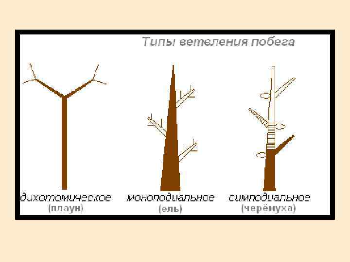 Ветвление побегов Поскольку побег является осевым органом, у него присутствует апикальная меристема, которая обеспечивает неограниченное нарастание в длину. Такой рост сопровождается более или менее регулярным ветвлением побега. У низших растений в результате ветвления возникает разветвлённый таллом (слоевище), у высших — образуются системы побегов и корней. Ветвление позволяет многократно увеличивать фотосинтетическую поверхность и обеспечивать растение органическими веществами.