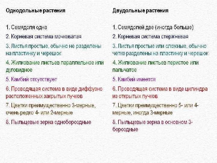 Сравнение двудольных и однодольных