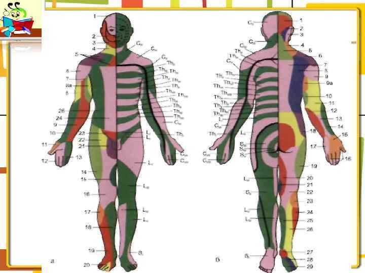 Проводниковый отдел кожного анализатора Проводящие пути поверхностной (красный цвет) и глубокой (синий цвет) чувствительности. 1 — клетка межпозвонкового ганглия; 2 — чувствительная клетка заднего рога; 3 — латеральный спинно-таламический проводящий путь; 4 — клетка дорсовентрального ядра таламуса; 5 — кора постцентральной извилины; 6 — нежный и клиновидный пучки; 7 — ядра нежного и клиновидного пучков; 8 — медиальная петля.