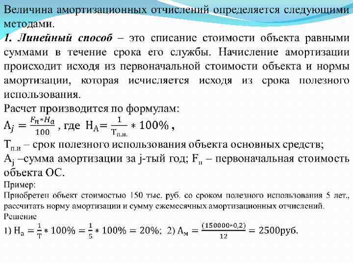 Начисление амортизационных отчислений по объекту ОС начинается с первого числа месяца, следующего за месяцем принятия этого объекта к учету. Начисление амортизации прекращается с первого числа месяца, следующего за месяцем полного погашения стоимости этого объекта либо списания этого объекта с учета. Для начисления амортизации необходимо определить срок полезного использования объекта ОС. Срок полезного использования – это период, в течение которого использование объекта основных средств призвано приносить доход или служить для выполнения целей деятельности предприятия. Срок полезного использования объекта определяется приемке его на учет. Для этого используются либо централизованные данные, либо из технических условий объекта.