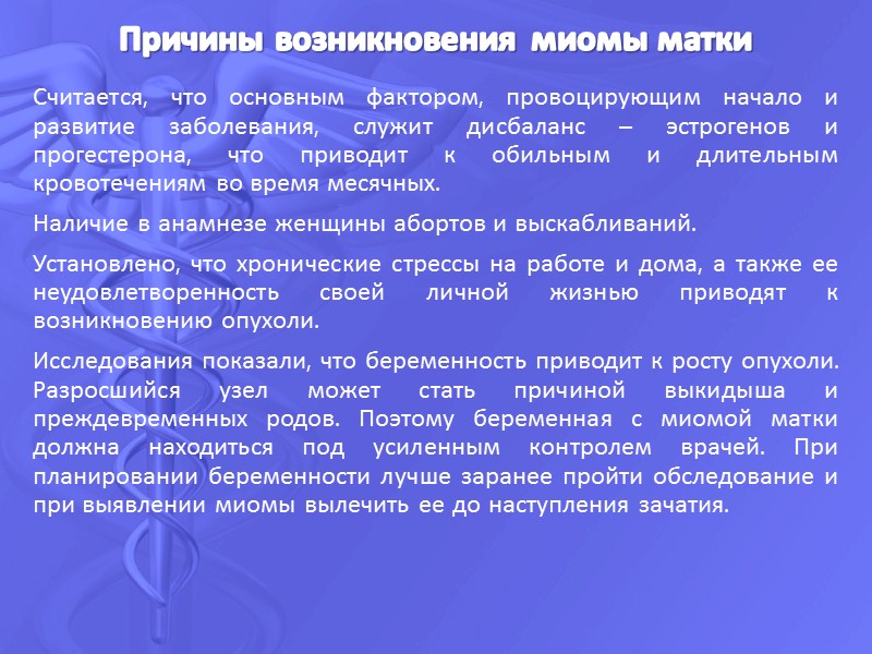 Считается, что основным фактором, провоцирующим начало и развитие заболевания, служит дисбаланс – эстрогенов и прогестерона, что приводит к обильным и длительным кровотечениям во время месячных. Наличие в анамнезе женщины абортов и выскабливаний. Установлено, что хронические стрессы на работе и дома, а также ее неудовлетворенность своей личной жизнью приводят к возникновению опухоли. Исследования показали, что беременность приводит к росту опухоли. Разросшийся узел может стать причиной выкидыша и преждевременных родов. Поэтому беременная с миомой матки должна находиться под усиленным контролем врачей. При планировании беременности лучше заранее пройти обследование и при выявлении миомы вылечить ее до наступления зачатия. Причины возникновения миомы матки