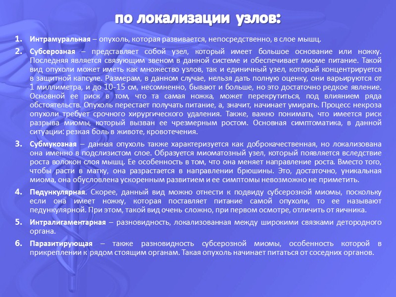 Классификация миом по темпу роста; по гистологической структуре; по клинической картине; по локализации узлов.