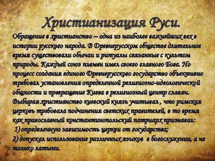 Христианизация Руси. Обращение в христианство – одна из наиболее важнейших вех в истории русского народа. В Древнерусском обществе длительное время существовали обычаи и ритуалы связанные с культом природы. Каждый союз племен имел своего главного Бога. Но процесс создания единого Древнерусского государство объективно требовал установления определенной религиозно-идеологической общности и превращение Киева в религиозный центр славян. Выбирая христианство киевский князь учитывал , что римская церковь требовала подчинения светских правителей, в то время как православный константинопольский патриарх признавал : 1) определенную зависимость церкви от государства; 2) допускал использование различных языков в богослужении, а не только латыни.
