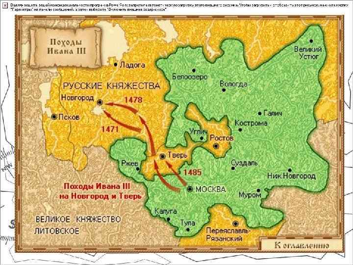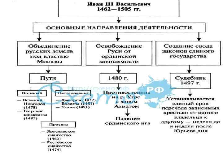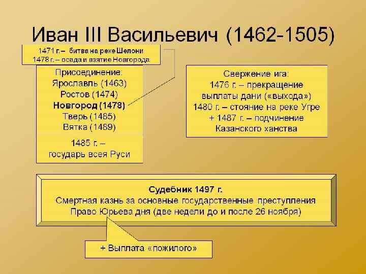 1. Присоединение к Москве крупных территорий -Новгорода, -Тверского княжества - Вятской земли 2. Ликвидация мелких княжеств и уделов 3. возникновение поместий и формирование нового сословия – дворянства. - 1489 5. Перестройка московского Кремля( из красного кирпича, внутри строили храмы: Успенский, Архангельский. 6. В 1490 году состоялся церковный собор, осудивший еретиков 7. Принят Судебник (введение «Юрьево» дня) - 1497 8. Ликвидировано монголо – татарское иго (стояние на Угре). 9. Прошли 2 успешные войны с Литвой - 1487 – 1494 10. Укрепление позиций в Прибалтике – строительство Ивангорода - 1500 – 1503 11. Объявление русской церкви автокефальной - 1448