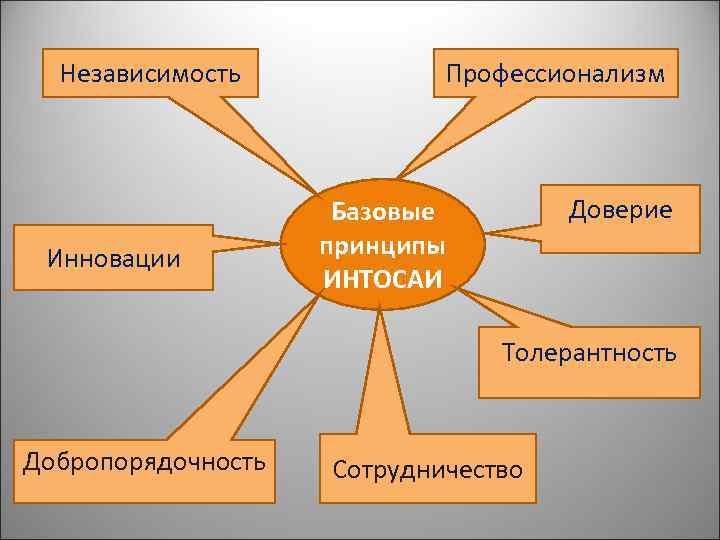 Независимость Инновации Профессионализм Доверие Базовые принципы ИНТОСАИ Толерантность Добропорядочность Сотрудничество