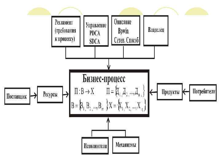 Отличительные черты Входы Процесса – входные объекты (сырье, продукция, комплектация, информация или услуга), которые преобразуются в Выходы Процесса, в ходе выполнения Процесса. Часто Входы одного Процесса являются выходами другого; l Выходы Процесса – продукция, информация или услуга ради которой существует Процесс. l Модель процессов организации – объединение взаимосвязанных и взаимосогласованных Процессов организации в единую систему. l