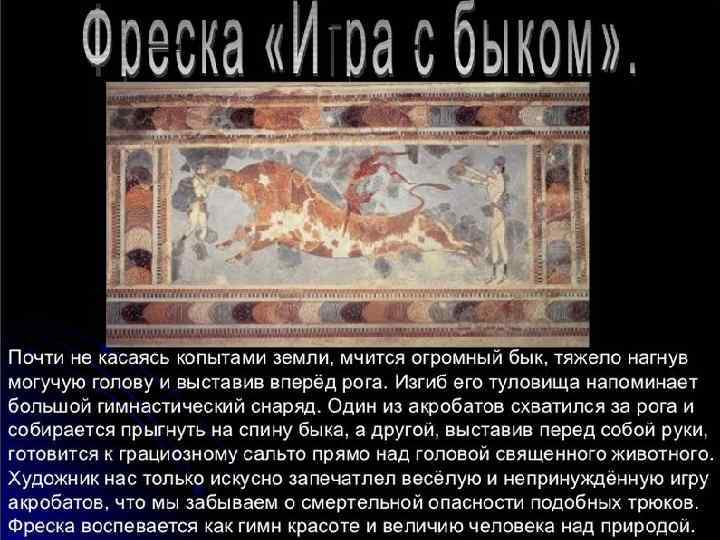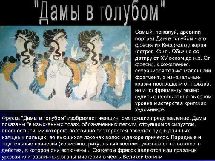 Синие дельфины и цветные рыбы Непосредственная свежесть восприятия природы отличает и фреску «Синие дельфины и цветные рыбы» на голубом фоне моря, на стене одного из «помещений царицы» в Кноссе.