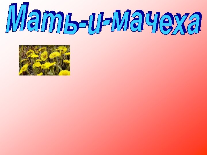 Мать – и - мачеха Мать-и-мачеха - род многолетних трав семейства сложноцветных. С давних времен применяется как лекарственное средство. Цветки золотисто-жёлтые. Цветёт ранней весной, а позже, к началу лета, появляются её большие листья. Сверху они гладкие, холодные, а снизу пушистые и теплые. Растение широко распространено в Евразии, Восточной Сибири, Казахстане, в горах Средней Азии и Южной Сибири, Малой Азии и Северной Африке, а также в Северной Америке. Обычно встречается на берегах водоёмов, на склонах оврагов и оползней, нередко на полях, пустырях, свалках.