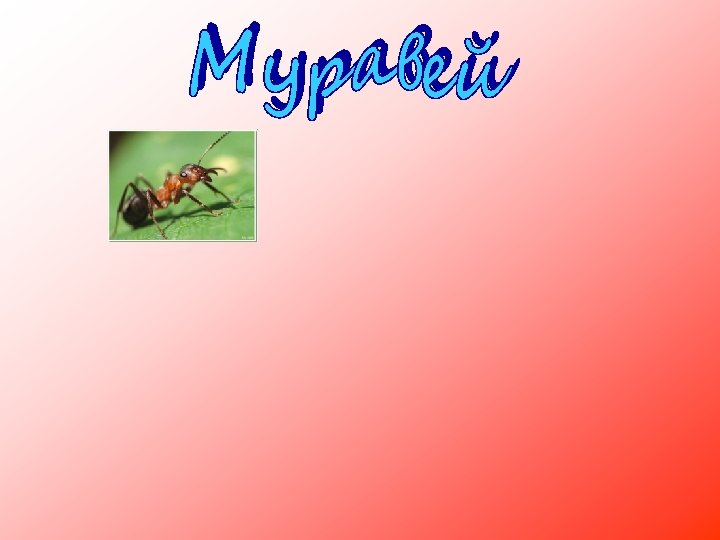 Рыжий лесной муравей Долго дом из хворостинок Собирали для семьи, Не жалея ног и спинок, Непоседы муравьи. (Е. Николаева) Муравьи длиной около 7— 14 мм, красно-бурого цвета, имеют крупную голову, половину брюшка занимает кислая ядовитая железа. Муравьи – трудолюбивые животные. У них плохое зрение, но зато сильно развиты органы обоняния и осязания на усиках. Шевеля ими, муравей обнюхивает и ощупывает все встречные предметы. По запаху насекомые узнают «своих» и «чужих» , по запаху следов находят дорогу к муравейнику, вокруг которого много «душистых тропинок» , протоптанных муравьями. Поздней осенью жизнь муравейника замирает. Его обитатели забираются в глубокие подземные камеры и, сбившись в большой ком, оцепеневают. Весной, когда растает снег и землю прогреет солнце, муравейники снова оживают. Живут муравьи в лесах умеренного пояса северной Евразии, где хорошо заметны по своим крупным муравейникам из хвоинок и веточек (до 2 метров в высоту).
