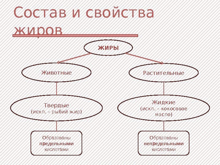 Состав и свойства жиров ЖИРЫ Животные Растительные Жидкие (искл. – кокосовое масло)Твердые (искл. – рыбий жир) Образованы предельными кислотами Образованы непредельными кислотами