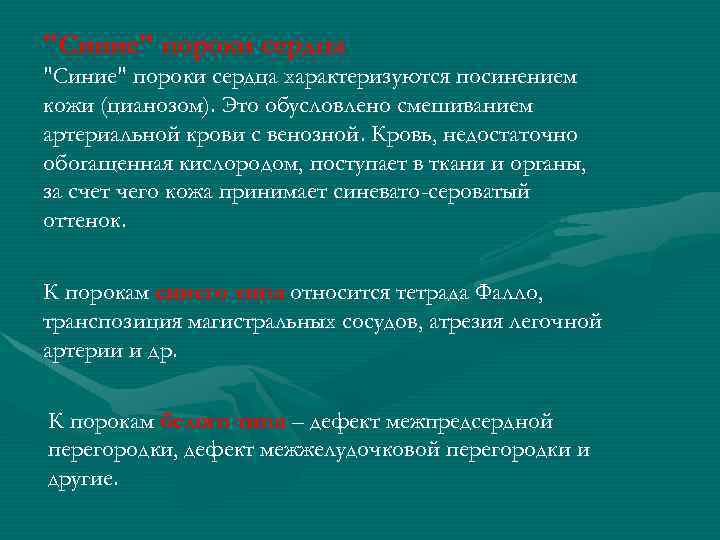 "Синие" пороки сердца характеризуются посинением кожи (цианозом). Это обусловлено смешиванием артериальной крови с венозной. Кровь, недостаточно обогащенная кислородом, поступает в ткани и органы, за счет чего кожа принимает синевато-сероватый оттенок. К порокам синего типа относится тетрада Фалло, транспозиция магистральных сосудов, атрезия легочной артерии и др. К порокам белого типа – дефект межпредсердной перегородки, дефект межжелудочковой перегородки и другие.
