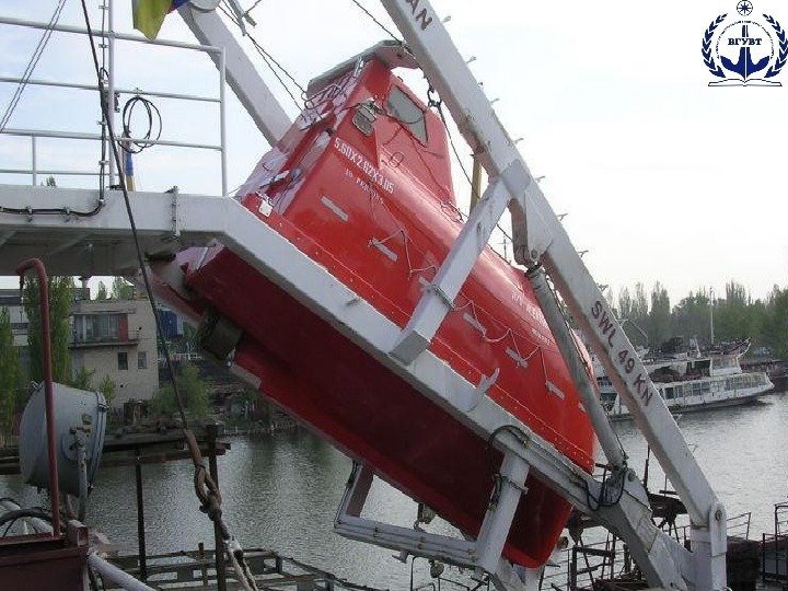 Шлюпбалки Спуск и подъем шлюпки механизированы и осуществляются одним человеком, находящимся на палубе или даже в шлюпке, посредством шлюпбалки. • На транспортных судах чаще всего применяют гравитационные, заваливающиеся и реже поворотные шлюпбалки.