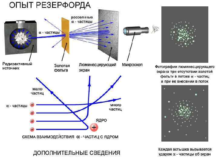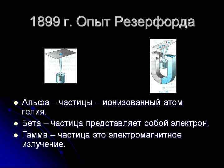 После открытия радиоактивных элементов началось исследование физической природы их излучения, этим занялся Резерфорд. Классический опыт, позволивший обнаружить сложный состав радиоактивного излучения, состоял в следующем. Радиоактивный препарат помещался на дно узкого канала в куске свинца. Против канала находилась фотопластинка. На выходившее из канала излучение действовало сильное магнитное поле, линии индукции которого перпендикулярны лучу. Вся установка размещалась в вакууме.