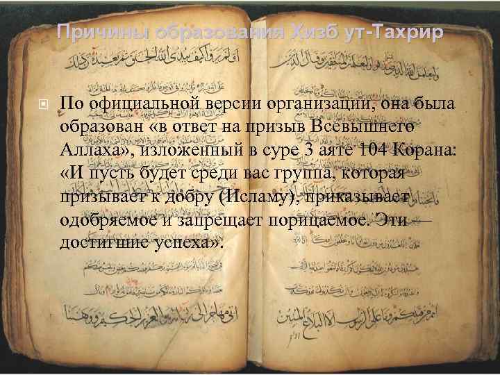 Причины образования Хизб ут-Тахрир По официальной версии организации, она была образован «в ответ на призыв Всевышнего Аллаха» , изложенный в суре 3 аяте 104 Корана: «И пусть будет среди вас группа, которая призывает к добру (Исламу), приказывает одобряемое и запрещает порицаемое. Эти — достигшие успеха» .