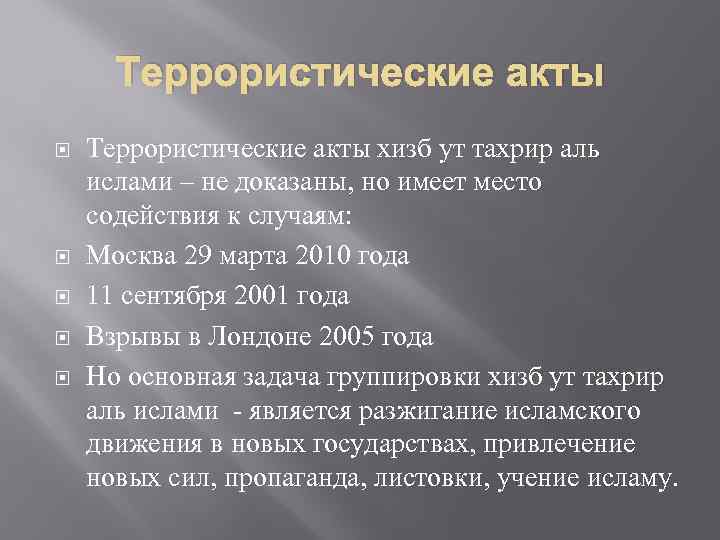 Террористические акты Террористические акты хизб ут тахрир аль ислами – не доказаны, но имеет место содействия к случаям: Москва 29 марта 2010 года 11 сентября 2001 года Взрывы в Лондоне 2005 года Но основная задача группировки хизб ут тахрир аль ислами - является разжигание исламского движения в новых государствах, привлечение новых сил, пропаганда, листовки, учение исламу.