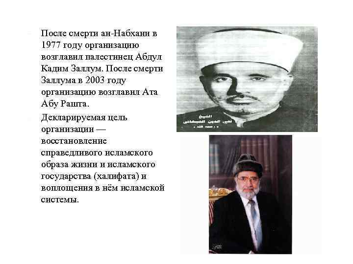 После смерти ан-Набхани в 1977 году организацию возглавил палестинец Абдул Кадим Заллум. После смерти Заллума в 2003 году организацию возглавил Ата Абу Рашта. Декларируемая цель организации — восстановление справедливого исламского образа жизни и исламского государства (халифата) и воплощения в нём исламской системы.