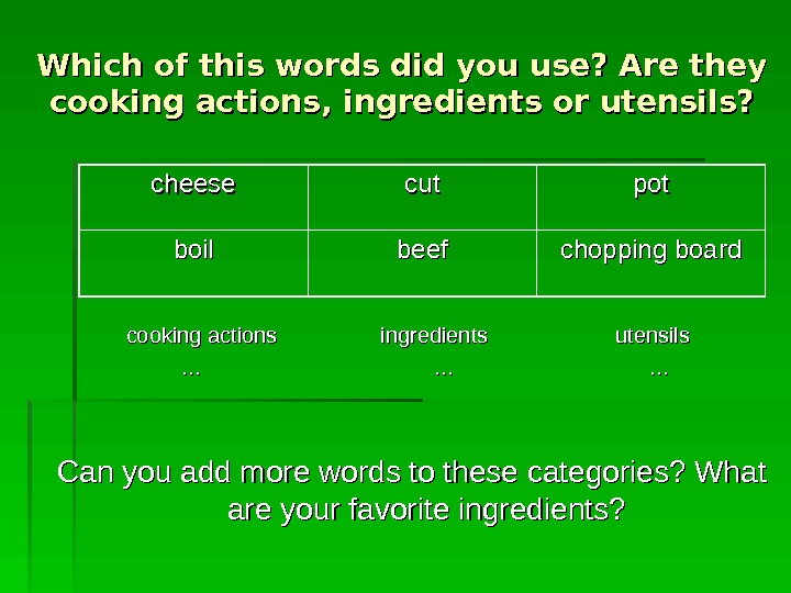 Which of this words did you use? Are they cooking actions, ingredients or utensils? cooking actions ingredients utensils … … Can you add more words to these categories? What are your favorite ingredients? cheese cutcut potpot boil beef chopping board