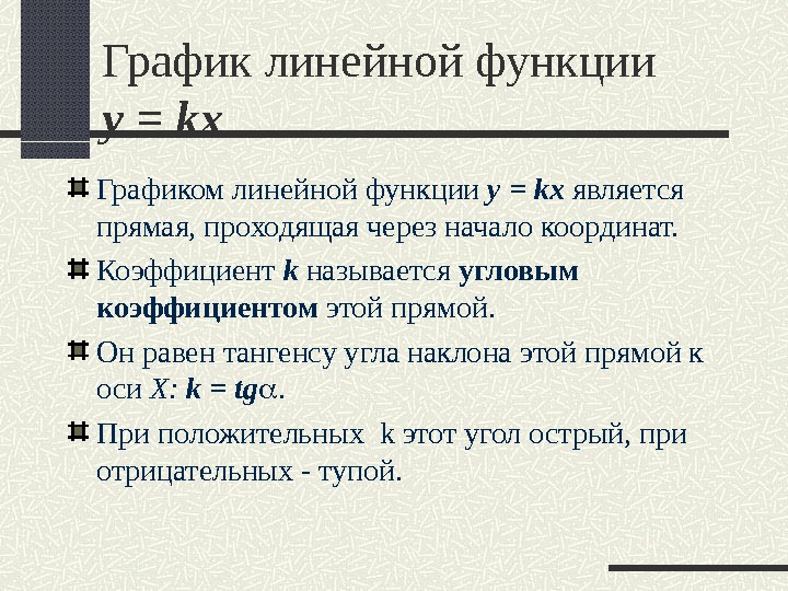 График линейной функции y = kx Графиком линейной функции y = kx является прямая, проходящая через начало координат. Коэффициент k называется угловым коэффициентом этой прямой. Он равен тангенсу угла наклона этой прямой к оси X: k = tg . При положительных k этот угол острый, при отрицательных — тупой.