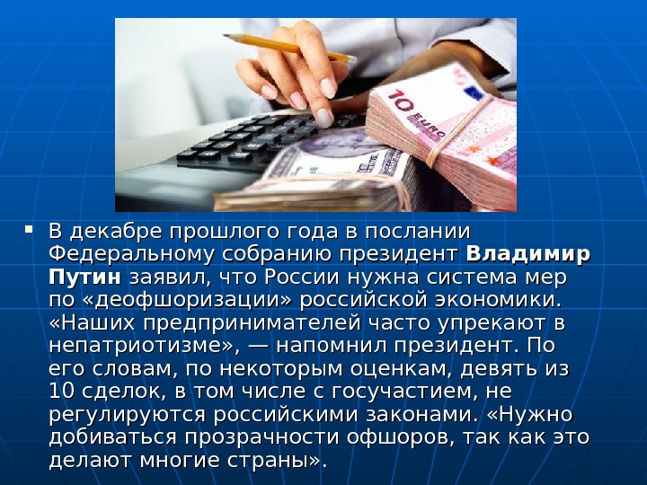В декабре прошлого года в послании Федеральному собранию президент Владимир Путин заявил, что России нужна система мер по «деофшоризации» российской экономики. «Наших предпринимателей часто упрекают в непатриотизме» , — напомнил президент. По его словам, по некоторым оценкам, девять из 10 сделок, в том числе с госучастием, не регулируются российскими законами. «Нужно добиваться прозрачности офшоров, так как это делают многие страны» .