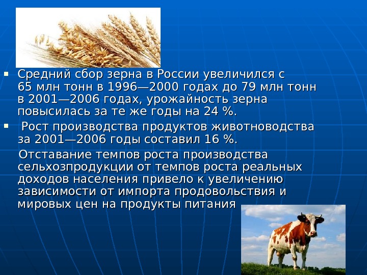 Средний сбор зерна в России увеличился с 65млн тонн в 1996— 2000 годах до 79млн тонн в 2001— 2006 годах, урожайность зерна повысилась за те же годы на 24%. Рост производства продуктов животноводства за 2001— 2006 годы составил 16%. Отставание темпов роста производства сельхозпродукции от темпов роста реальных доходов населения привело к увеличению зависимости от импорта продовольствия и мировых цен на продукты питания