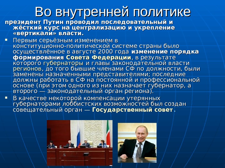 Во внутренней политике президент Путин проводил последовательный и жёсткий курс на централизацию и укрепление «вертикали» власти. Первым серьёзным изменением в конституционно-политической системе страны было осуществлённое в августе 2000 года изменение порядка формирования Совета Федерации , в результате которого губернаторы и главы законодательной власти регионов , до того бывшие членами СФ по должности, были заменены назначенными представителями; последние должны работать в СФ на постоянной и профессиональной основе (при этом одного из них назначает губернатор, а второго— законодательный орган региона). В качестве некоторой компенсации утерянных губернаторами лоббистских возможностей был создан совещательный орган— Государственный совет. .