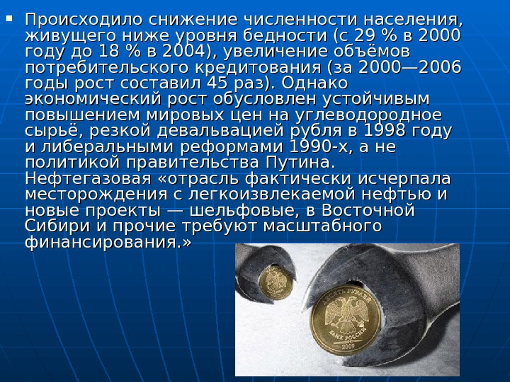 Происходило снижение численности населения, живущего ниже уровня бедности (с 29% в 2000 году до 18% в 2004), увеличение объёмов потребительского кредитования (за 2000— 2006 годы рост составил 45 раз). Однако экономический рост обусловлен устойчивым повышением мировых цен на углеводородное сырьё, резкой девальвацией рубля в 1998 году и либеральными реформами 1990-х, а не политикой правительства Путина. Нефтегазовая «отрасль фактически исчерпала месторождения с легкоизвлекаемой нефтью и новые проекты— шельфовые, в Восточной Сибири и прочие требуют масштабного финансирования. »