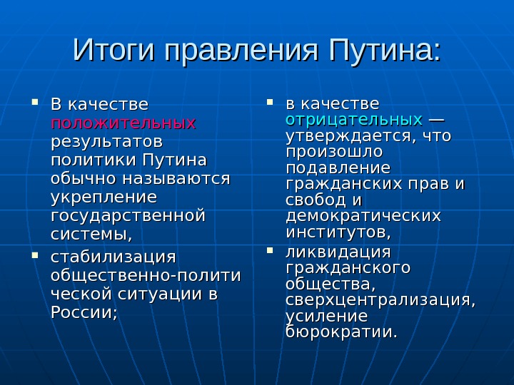 Итоги правления Путина: В качестве положительных результатов политики Путина обычно называются укрепление государственной системы, стабилизация общественно-полити ческой ситуации в России; в качестве отрицательных — — утверждается, что произошло подавление гражданских прав и свобод и демократических институтов, ликвидация гражданского общества, сверхцентрализация, усиление бюрократии.