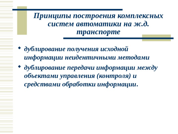 Принципы построения комплексных систем автоматики на ж. д. транспорте дублирование получения исходной информации неидентичными методами дублирование передачи информации между объектами управления (контроля) и средствами обработки информации.