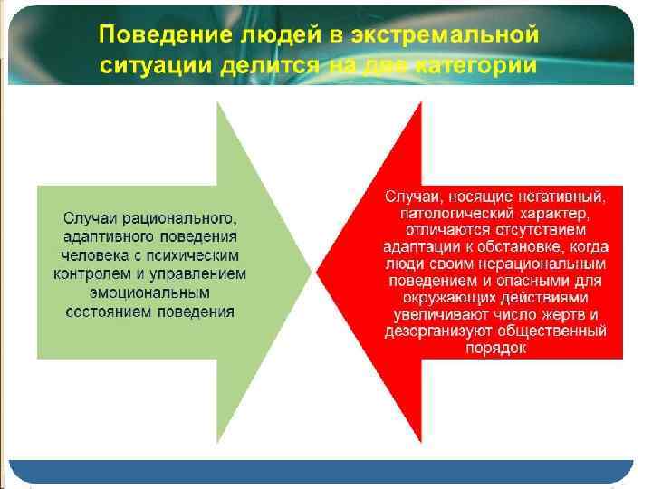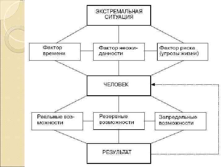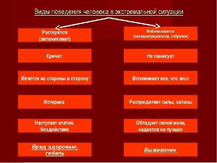 ЭКСТРЕМАЛЬНАЯ СИТУАЦИЯ Известная мудрость гласит: «Жизнь на 10% состоит из того, что с нами происходит, и на 90% — из того, что мы об этом думаем» . Под экстремальными подразумевают такие ситуации, которые выходят за пределы обычного, «нормального» человеческого опыта. Иначе говоря, экстремальность ситуации определяют факторы, к которым человек еще не адаптирован и не готов действовать в их условиях. Степень экстремальности ситуации определяется силой, продолжительностью, новизной, непривычностью проявления этих факторов. Восприятие одной и той же ситуации каждым конкретным человеком индивидуально, в связи с чем критерий «экстремальности» находится, скорее, во внутреннем, психологическом плане личности. В качестве факторов, определяющих экстремальность, могут рассматриваться следующие: Различные эмоциогенные воздействия в связи с опасностью, трудностью, новизной, ответственностью ситуации. (Эмоциогенный объект — объект, вызывающий ту или иную эмоциональную реакцию, как волнение, агрессия, избегание и др. ). Дефицит необходимой информации или явный избыток противоречивой информации. Чрезмерное психическое, физическое, эмоциональное напряжение. Воздействие неблагоприятных климатических условий: жары, холода, кислородной недостаточности и т. д. Наличие голода, жажды. Экстремальные ситуации (угроза потери здоровья или жизни ) могут приводить к развитию болезненных состояний — травматического и посттравматического стресса, других невротических и психических расстройств.