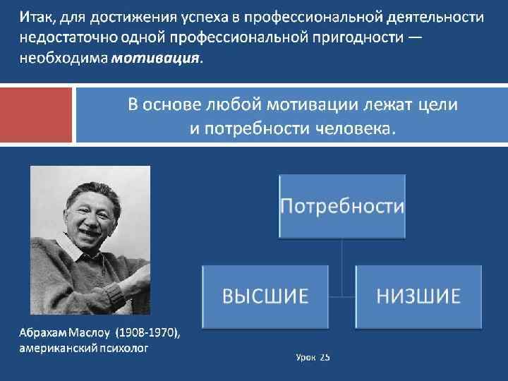 Путь к эффективной профессиональной деятельности человека лежит через понимание его мотивации. Только зная то, что движет человеком, что побуждает его к деятельности, какие мотивы лежат в основе его действий, можно попытаться разработать эффективную систему форм и методов управления им. Мотив – побуждение к деятельности. Нет мотива – нет деятельности. В основе любой мотивации лежат потребности. Потребность – это ощущение, что чего-то не достает. .