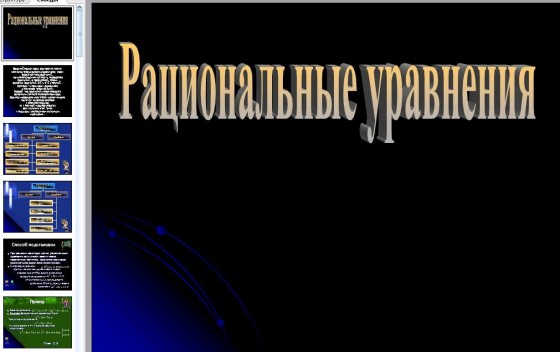Презентация на тему рациональных уравнений. Рассказывается про целые и дробные рациональные уравнения. Также затрагивается способ подстановки для их решения. В презентации показываются примеры с определенным видом уравнений и на следующем слайде показывается решение.