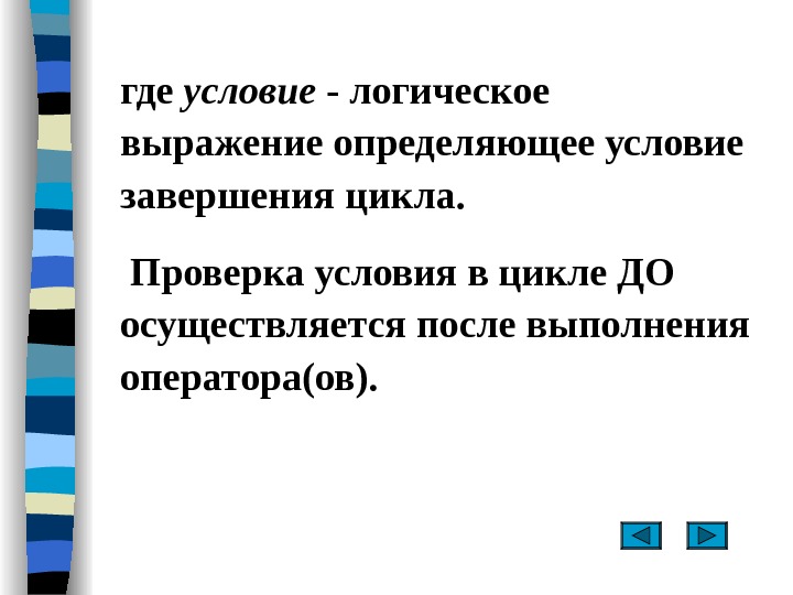 где условие — логическое выражение определяющее условие завершения цикла. Проверка условия в цикле ДО осуществляется после выполнения оператора(ов).