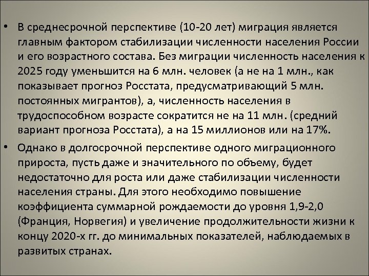 • В среднесрочной перспективе (10 -20 лет) миграция является главным фактором стабилизации численности населения России и его возрастного состава. Без миграции численность населения к 2025 году уменьшится на 6 млн. человек (а не на 1 млн. , как показывает прогноз Росстата, предусматривающий 5 млн. постоянных мигрантов), а, численность населения в трудоспособном возрасте сократится не на 11 млн. (средний вариант прогноза Росстата), а на 15 миллионов или на 17%. • Однако в долгосрочной перспективе одного миграционного прироста, пусть даже и значительного по объему, будет недостаточно для роста или даже стабилизации численности населения страны. Для этого необходимо повышение коэффициента суммарной рождаемости до уровня 1, 9 -2, 0 (Франция, Норвегия) и увеличение продолжительности жизни к концу 2020 -х гг. до минимальных показателей, наблюдаемых в развитых странах.