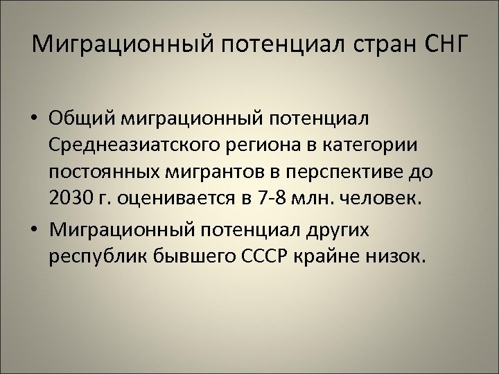 Миграционный потенциал стран СНГ • Общий миграционный потенциал Среднеазиатского региона в категории постоянных мигрантов в перспективе до 2030 г. оценивается в 7 -8 млн. человек. • Миграционный потенциал других республик бывшего СССР крайне низок.