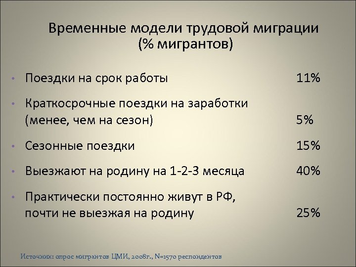 Временные модели трудовой миграции (% мигрантов) • Поездки на срок работы 11% • Краткосрочные поездки на заработки (менее, чем на сезон) 5% • Сезонные поездки 15% • Выезжают на родину на 1 -2 -3 месяца 40% • Практически постоянно живут в РФ, почти не выезжая на родину 25% Источник: опрос мигрантов ЦМИ, 2008 г. , N=1570 респондентов
