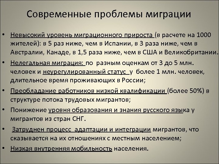 Современные проблемы миграции • Невысокий уровень миграционного прироста (в расчете на 1000 жителей): в 5 раз ниже, чем в Испании, в 3 раза ниже, чем в Австралии, Канаде, в 1, 5 раза ниже, чем в США и Великобритании. • Нелегальная миграция: по разным оценкам от 3 до 5 млн. человек и неурегулированный статус у более 1 млн. человек, длительное время проживающих в России; • Преобладание работников низкой квалификации (более 50%) в структуре потока трудовых мигрантов; • Понижение уровня образования и знания русского языка у мигрантов из стран СНГ. • Затруднен процесс адаптации и интеграции мигрантов, что сказывается на их отношениях с местным населением; • Низкая внутренняя мобильность населения.