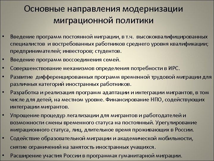 Основные направления модернизации миграционной политики • Введение программ постоянной миграции, в т. ч. высококвалифицированных специалистов и востребованных работников среднего уровня квалификации; предпринимателей; инвесторов; студентов. • Введение программ воссоединения семей. • Совершенствование механизмов определения потребности в ИРС. • Развитие дифференцированных программ временной трудовой миграции для различных категорий иностранных работников. • Разработка и реализация программ адаптации и интеграции мигрантов, в том числе для детей, на местном уровне. Финансирование НПО, содействующих интеграции мигрантов. • Упрощение процедур легализации для мигрантов и работодателей и возможности смены временного статуса на постоянный. Урегулирование миграционного статуса, лиц, длительное время проживающих в России. • Содействие образовательной миграции и академической мобильности, снятие ограничений на занятость иностранных учащихся. • Расширение участия России в программах гуманитарной миграции.