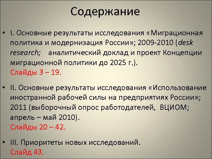Содержание • I. Основные результаты исследования «Миграционная политика и модернизация России» ; 2009 -2010 (desk research; аналитический доклад и проект Концепции миграционной политики до 2025 г. ). Слайды 3 – 19. • II. Основные результаты исследования «Использование иностранной рабочей силы на предприятиях России» ; 2011 (выборочный опрос работодателей, ВЦИОМ; апрель – май 2010). Слайды 20 – 42. • III. Приоритеты новых исследований. Слайд 43.